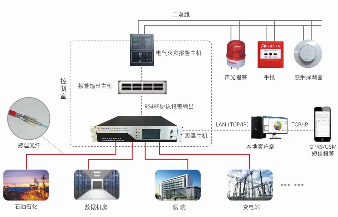 分布式哔咔漫画测温系统/火灾探測器,因为其本身安全、耐腐蚀、定位精确、长距离监測等特性,在货架检測的方案中有广泛应用。一般一台设备就能对几千格货架进行连续检测,并且显示实时温度曲线,一旦探测到检测货格内的温度异常,能快速响应,联动现场消防设备采取抢险措施。其系统图如下所示。